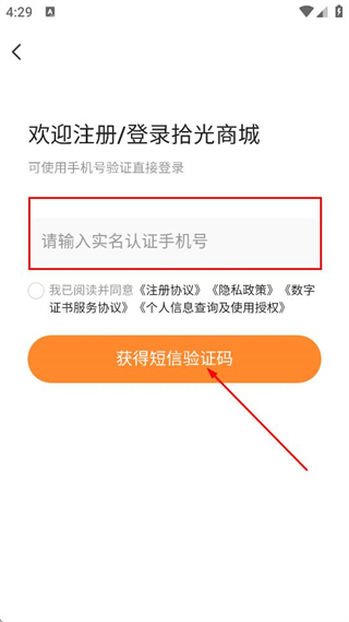 3、在登錄注冊頁面,輸入實名認證手機號,點擊獲得短信驗證碼。