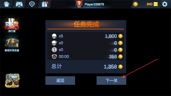 4、消滅所有敵人后,完成任務(wù)獲取金幣獎勵,點擊下一關(guān)繼續(xù)挑戰(zhàn)。