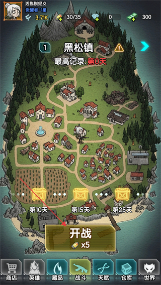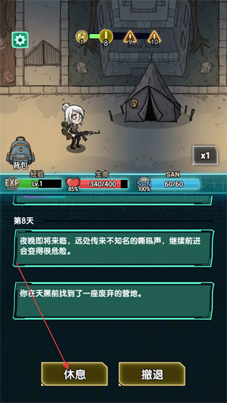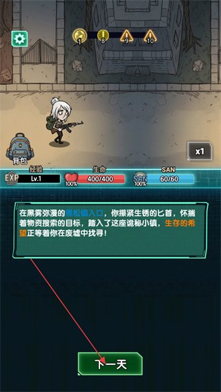 2、在戰(zhàn)斗界面可以看到角色的等級(jí)以及生命值等屬性,點(diǎn)擊下一天按鈕進(jìn)行冒險(xiǎn)探索。