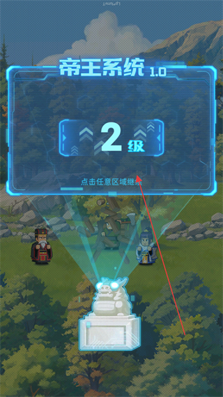 3、完成任務(wù)后,帝王系統(tǒng)升級如升至2級,點(diǎn)擊任意區(qū)域繼續(xù)游戲,解鎖新功能或提升屬性。