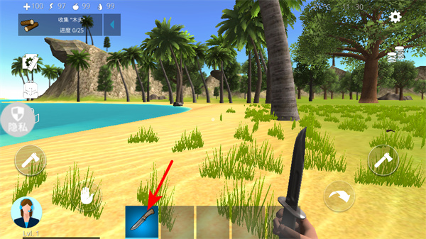 2、游戲中點擊匕首圖標(biāo)可切換武器,切換后可用于采集資源或防御野獸,提升生存能力。