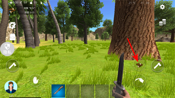 3、點擊采集圖標(biāo)可獲取木材資源,采集時需關(guān)注資源數(shù)量,積累足夠木材用制作工具建筑。