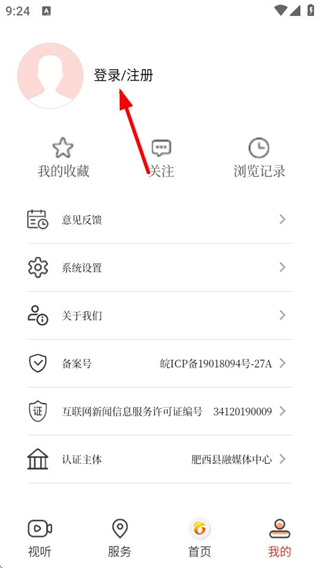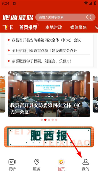 1、在肥西融媒首頁(yè),點(diǎn)擊右下角我的選項(xiàng),進(jìn)入個(gè)人頁(yè)面。