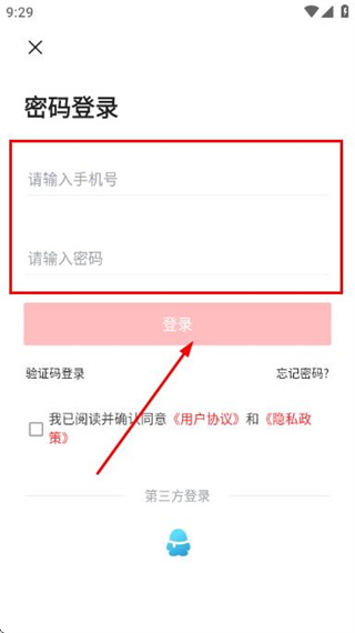 4、在密碼登錄頁面填寫手機號和密碼,勾選協(xié)議后,點擊【登錄】完成賬號登錄操作。