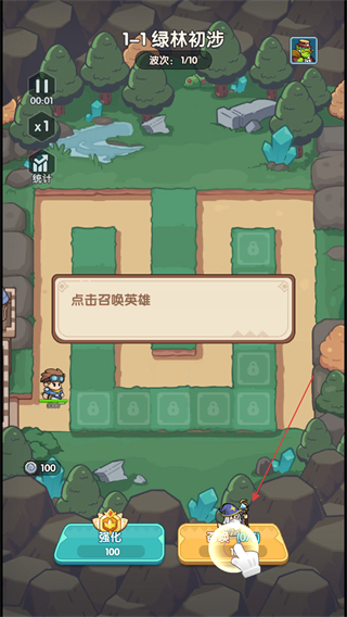 1、點(diǎn)擊界面下方召喚英雄按鈕可召喚英雄,召喚存在時(shí)間間隔,需根據(jù)怪物波次節(jié)奏合理召喚以布局防御。