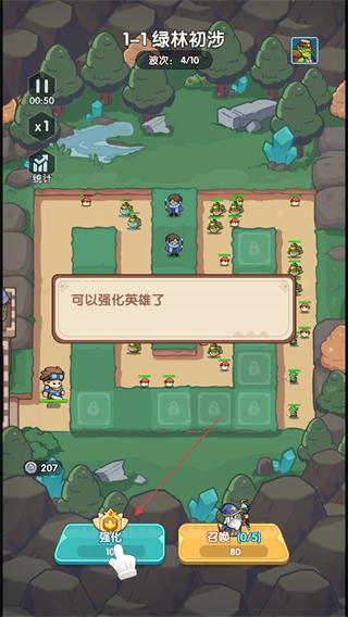 3、點(diǎn)擊藍(lán)色強(qiáng)化按鈕可消耗金幣提升戰(zhàn)力,在金幣充足或怪物進(jìn)攻壓力較大時(shí)使用,有效增強(qiáng)防御能力。