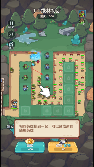4、將相同英雄拖拽到一起可合成新的隨機(jī)英雄,合成后英雄戰(zhàn)力大幅提升,建議在怪物波次間隙進(jìn)行合成以優(yōu)化陣容。