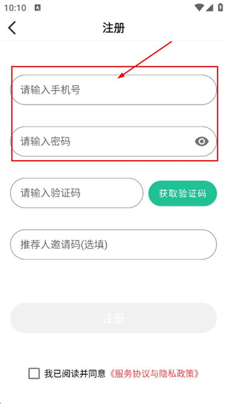 4、在注冊界面,輸入手機號、密碼,來進行下一步的操作。