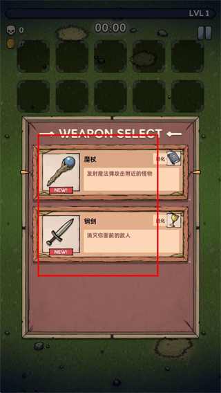 武器選擇界面提供不同類型的戰(zhàn)斗裝備如范圍攻擊的魔杖、單體輸出的鋼劍,且武器效果隨機適配關(guān)卡怪物,每一局冒險的武器組合都可能不同,讓探索充滿策略性。