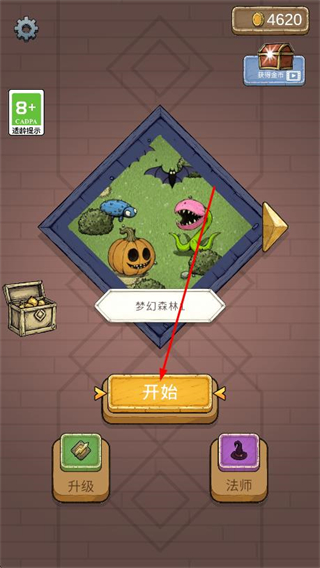 1、在主界面選擇夢幻森林關(guān)卡,點擊開始,進入石窟地牢冒險。