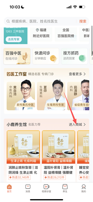 1、在小鹿中醫(yī)首頁,點(diǎn)擊進(jìn)入商城選項(xiàng),進(jìn)入小鹿養(yǎng)生商城頁面。