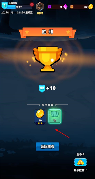 3、關(guān)卡勝利后領(lǐng)取金幣、道具等獎(jiǎng)勵(lì),積累資源助力游戲發(fā)展。