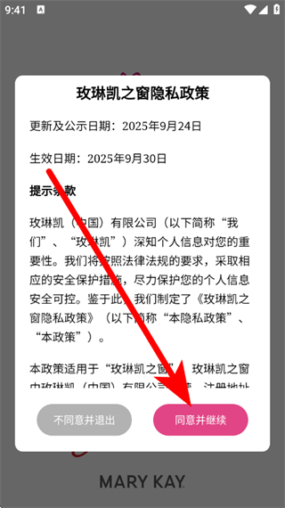 1、打開(kāi)玫琳凱之窗,在隱私政策彈窗中,點(diǎn)擊同意并繼續(xù)。
