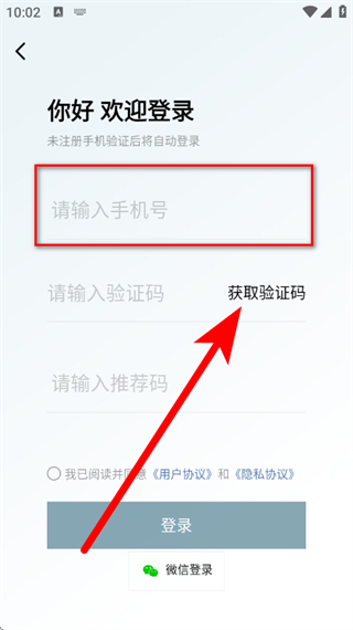 3、在登錄頁(yè)面,輸入手機(jī)號(hào),點(diǎn)擊獲取驗(yàn)證碼。