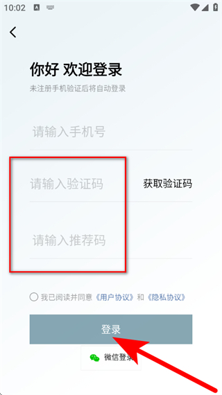 4、輸入驗(yàn)證碼及推薦碼,勾選后,點(diǎn)擊登錄,完成登錄。