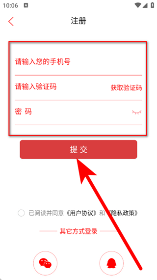 4、在注冊(cè)頁(yè)面,輸入手機(jī)號(hào)、驗(yàn)證碼及密碼后,點(diǎn)擊提交。