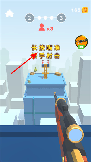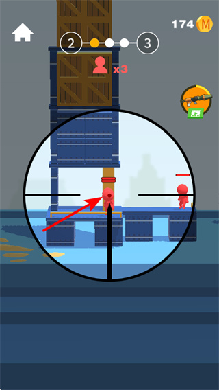 2、通過瞄準(zhǔn)鏡鎖定紅色小人目標(biāo),射擊時需對準(zhǔn)其身體關(guān)鍵部位,確保一擊命中,提升擊殺效率。