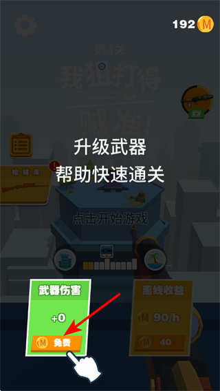4、點擊免費按鈕可升級武器,升級后武器傷害提升,助力快速通關(guān),積累可多次升級增強(qiáng)戰(zhàn)力。