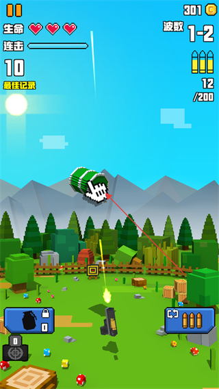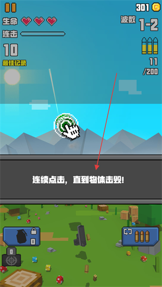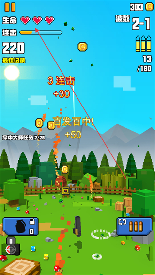 3、不斷消滅空中目標(biāo)和地面物體,積累金幣和連擊數(shù),提升游戲得分,同時(shí)完成命中大師任務(wù)等挑戰(zhàn)。