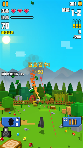 2、持續(xù)射擊目標(biāo),積累連擊數(shù),達(dá)成百發(fā)百中可獲得額外獎(jiǎng)勵(lì)如+50金幣。