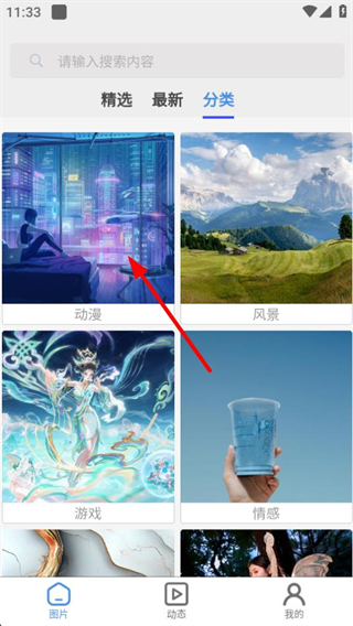 2、在分類選擇頁面,點擊動漫分類,進入動漫壁紙列表頁面。