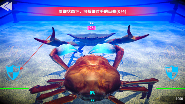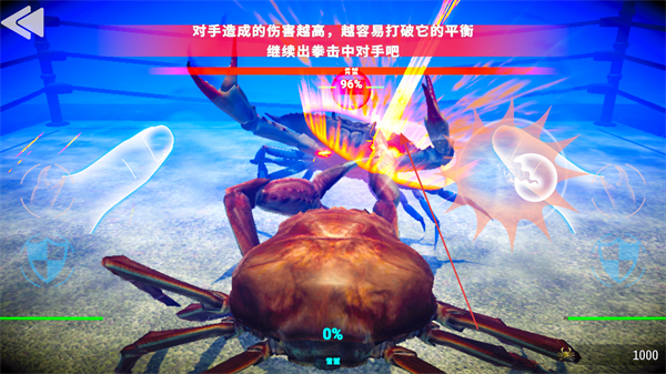 1、根據(jù)提示,點(diǎn)擊畫(huà)面左側(cè)或右側(cè)區(qū)域出拳,操控螃蟹攻擊對(duì)手。