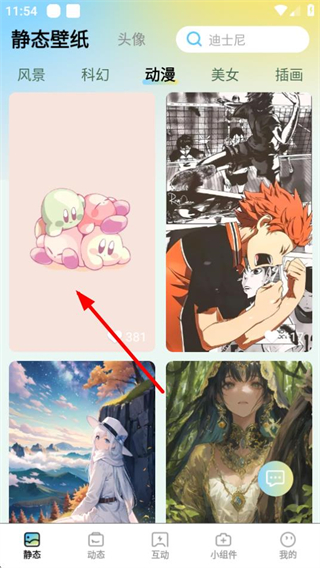 1、在靜態(tài)壁紙頁面,點(diǎn)擊動(dòng)漫分類標(biāo)簽,進(jìn)入動(dòng)漫類壁紙列表頁面。