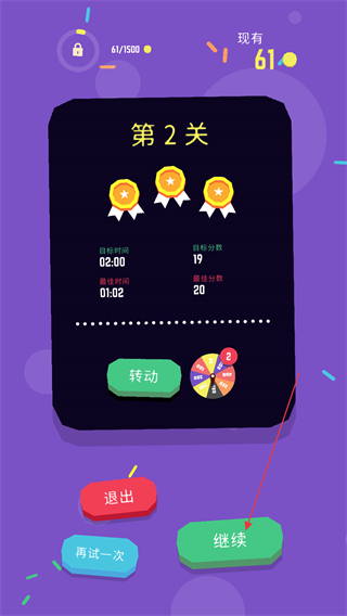 4、沖刺過終點線即為通過關(guān)卡,通過擊飛保齡球瓶的得分數(shù)進行徽章評分,點擊繼續(xù)按鈕可以開啟下一關(guān)。
