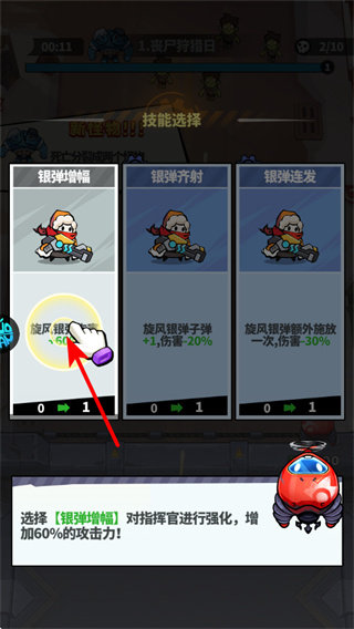 2、技能選擇時(shí)可優(yōu)先選擇銀彈增幅類(lèi)技能,選擇后能提升攻擊力如增加60%攻擊力,增強(qiáng)對(duì)喪尸打擊能力。