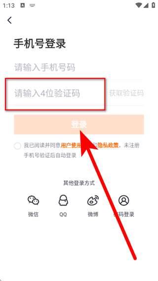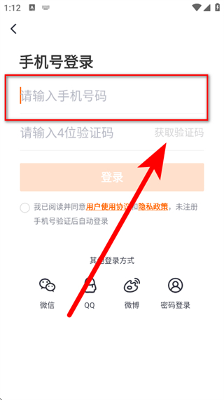 3、在登錄頁面,輸入手機(jī)號(hào)碼后,點(diǎn)擊獲取驗(yàn)證碼。