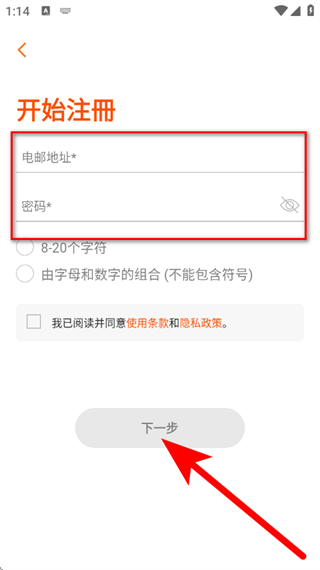 4、輸入電郵地址、密碼,勾選已閱讀并同意后,點(diǎn)擊下一步,完成注冊操作。
