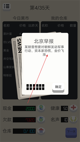 1、打開北漂浮生記游戲,開啟還債的北漂生活,點(diǎn)擊下一天可以更新黑市的價格增幅。