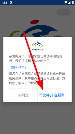 1、打開潮城騎行,在隱私政策彈窗中,點擊同意并開啟服務(wù)。