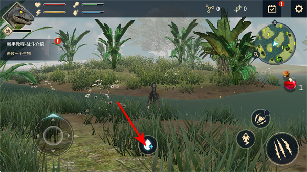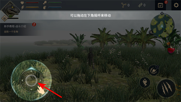 2、拖動(dòng)左下角搖桿可控制恐龍移動(dòng),移動(dòng)時(shí)需留意場(chǎng)景中的地形和資源分布,規(guī)劃移動(dòng)路線以高效探索或躲避危險(xiǎn)。