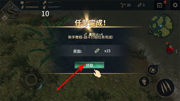 4、完成任務(wù)如新手教程任務(wù)后,點(diǎn)擊領(lǐng)取可獲取獎(jiǎng)勵(lì)如貨幣,領(lǐng)取后積累資源用于恐龍進(jìn)化或技能升級(jí)。