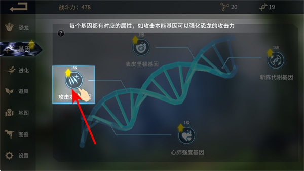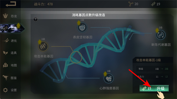 1、游戲中可升級基因如攻擊本能基因,升級后能強化對應(yīng)屬性如攻擊力,升級需消耗基因點數(shù),助力恐龍戰(zhàn)力提升。