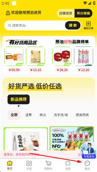 1、在預(yù)泊進(jìn)貨首頁點(diǎn)擊底部我的,進(jìn)入歡迎登錄頁面。