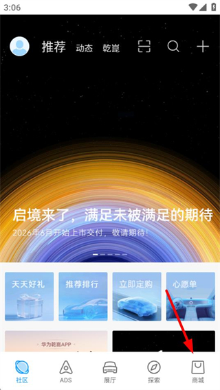 1、在華為乾崑首頁,點(diǎn)擊底部商城選項(xiàng),進(jìn)入商城頁面。