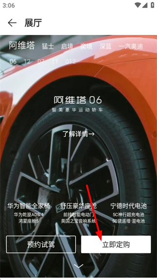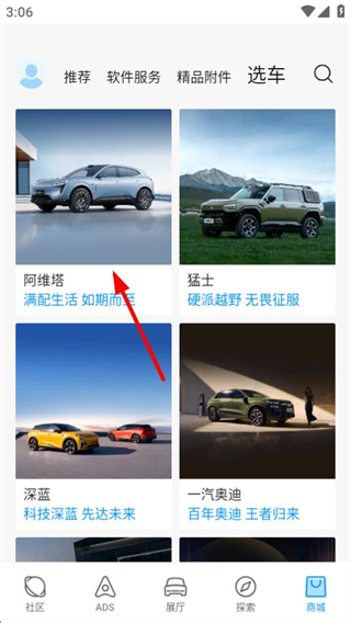 3、在選車頁面,點(diǎn)擊目標(biāo)品牌如阿維塔,進(jìn)入對(duì)應(yīng)車型詳情頁面。