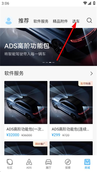 2、在商城頁面,點(diǎn)擊頂部選車標(biāo)簽,進(jìn)入選車頁面。