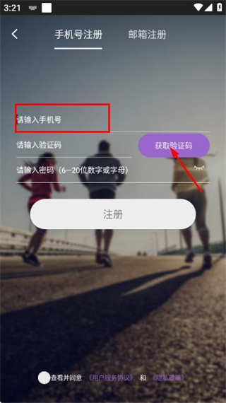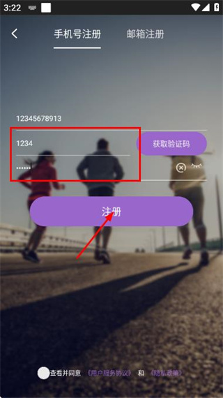 2、在手機(jī)號注冊頁面填寫手機(jī)號后,點擊獲取驗證碼按鈕。