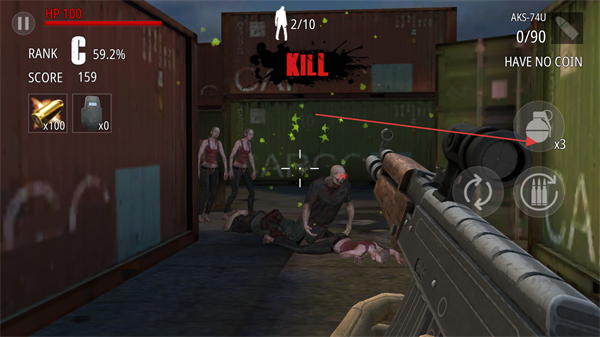 4、在彈藥不足或僵尸密集時,使用手雷技能,對僵尸群造成范圍傷害。