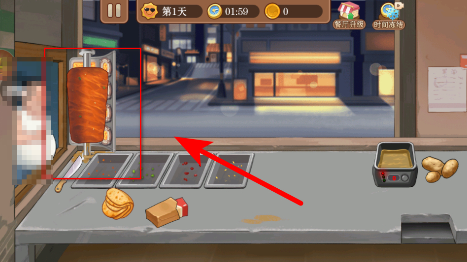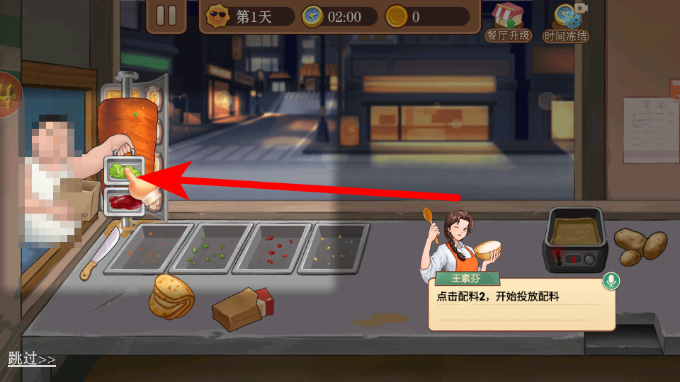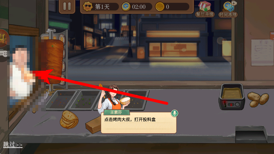 2、在店鋪內(nèi),按照提示點擊烤肉大叔,打開投料盒。