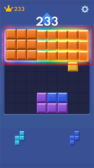 4、分?jǐn)?shù)233皇冠233時(shí),處理紅色方框內(nèi)橙色方塊,移動(dòng)底部方塊與之相連,觸發(fā)多排消除獲得高分。