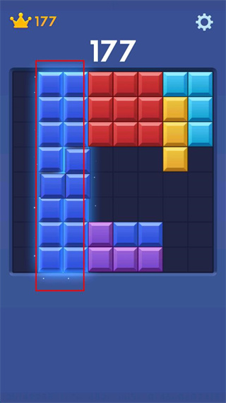 3、分?jǐn)?shù)177皇冠177時(shí),觀察左側(cè)紅色方框內(nèi)藍(lán)色方塊,移動(dòng)對(duì)應(yīng)方塊使其連成完整區(qū)域?qū)崿F(xiàn)消除。