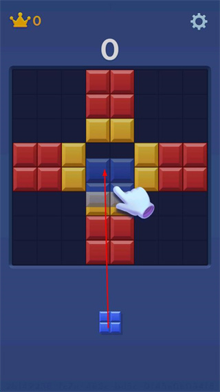 1、將底部藍(lán)色方塊向上移動(dòng)至中間藍(lán)色方塊位置,使相同顏色方塊相連消除,初始分?jǐn)?shù)為0皇冠數(shù)量為0。