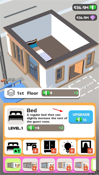 1、在房屋內(nèi)布置家具并升級,提升房間租金收益,開啟房產(chǎn)經(jīng)營之旅。