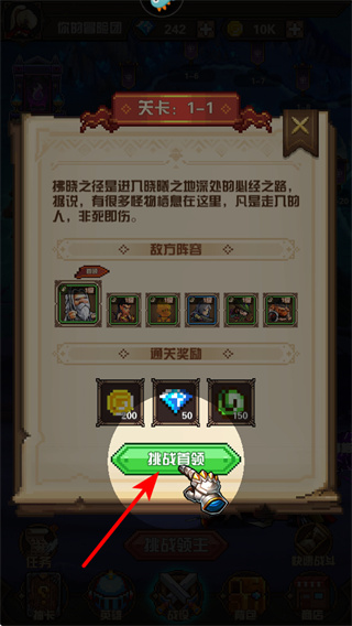 1、挑戰(zhàn)首領(lǐng)可進(jìn)入關(guān)卡,進(jìn)入前可查看敵方陣容和通關(guān)獎(jiǎng)勵(lì),結(jié)合自身戰(zhàn)力判斷是否挑戰(zhàn),挑戰(zhàn)成功后獲取金幣。
