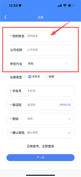 2、在注冊界面,填寫姓名、公司名稱,選擇所在行業(yè)。