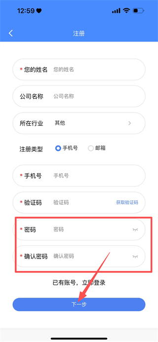 4、設置登錄密碼并再次確認密碼,點擊下一步,完成賬號注冊操作。